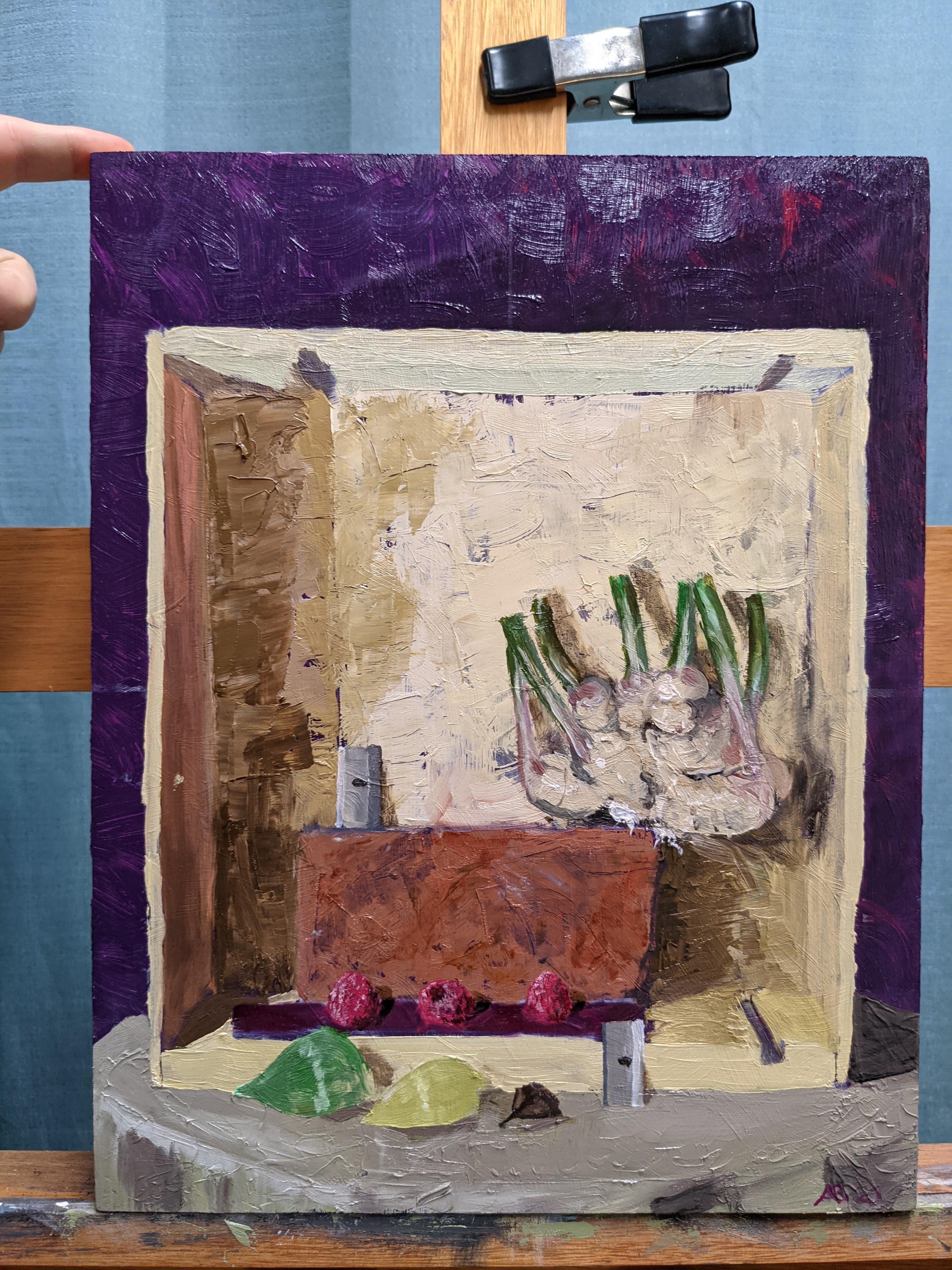 Still life, oil on linen, 23″ x 24″, unframed (gallery wrapped), $1,250